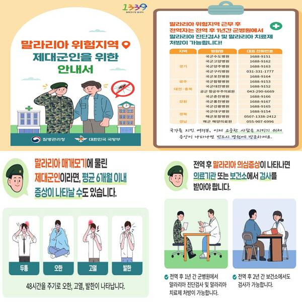 김미경 은평구청장은 "관내 군 장병은 말라리아 매개모기의 주요 활동 시기인 6월부터 10월까지 모기에게 물리지 않도록 기피제를 뿌리고, 훈련 등 야외 취침 시 모기장을 사용해야 한다“며 ”전역 이후 발열, 두통, 오한 등 의심 증상이 나타나면 가까운 보건소 또는 군 병원을 방문해 반드시 말라리아 검사를 받길 바란다“ 말했다.