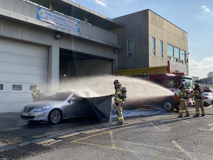 이날 훈련은 전기차 화재특성에 맞는 대응으로 질식소화덮개를 활용하여 화재차량을 밀폐하고, 발화부 방수, 냉각하여 화재를 진압하는 훈련으로 진행되었다.