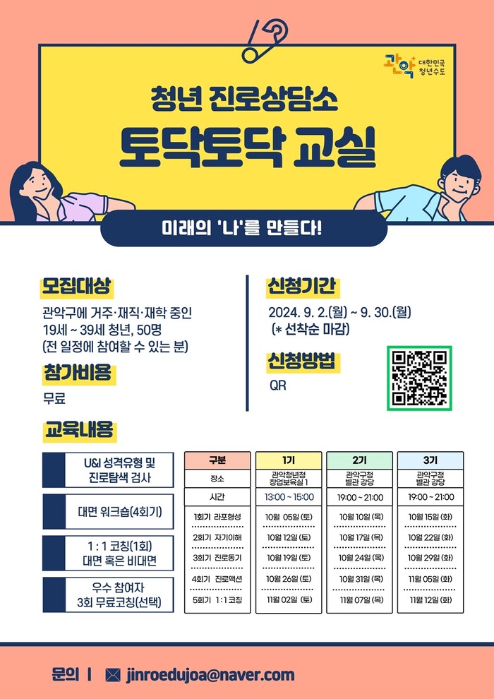 [시민일보 = 문민호 기자] 서울 관악구(구청장 박준희)가 청년들의 취업과 진로 고민을 해결하기 위해 맞춤형 진로 상담 프로그램인 청년 진로상담소 ‘토닥토닥 교실’의 참여자를 오는 30일까지 모집하고 있다고 13일 밝혔다.