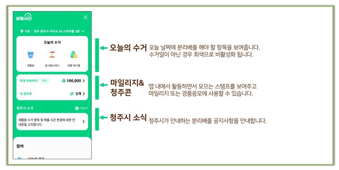‘버릴시간’은 청주페이 어플을 통해 접속해 쓰레기 수거시간, 올바른 배출방법 등을 재미있고 쉽게 알려주고, 참여하는 시민들에게 다양한 인센티브(청주페이, 경품)를 지급하는 청주페이 부가 서비스다.