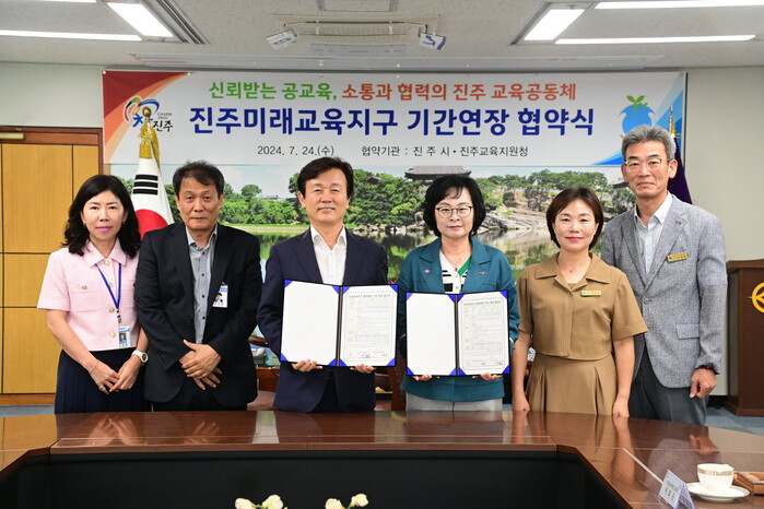 진주시는 24일 시청에서 조규일 진주시장과 이외숙 진주교육지원청 교육장이 참석한 가운데 미래교육지구사업을 연장하는 협약식을 가졌다.