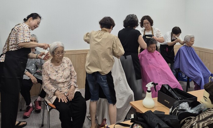 경기 과천시 부림동 문화교육센터에서 활동 중인 미용 동아리 ‘곱슬머리’가 지난 12일 지역내 홀몸노인들을 대상으로 이발 봉사활동을 진행하고, 마을 나들이를 한 뒤 부림동 주민센터 직원들과의 담소를 나눴다. 사진은 이날 거동이 불편한 홀몸노인들에게 이발 봉사를 진행하고 있는 모습.(사진=과천시청 제공)