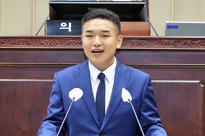 | ▲ 의왕시의회 한채훈 의원이 2026년 철도의 날 기념행사를 철도특구인 의왕시에서 열릴 수 있도록 기념식 유치를 위한 정책을 제안하고 있다 /사진제공=의왕시의회 |