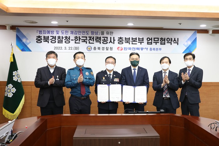 3월 22일(화) 한국전력공사 충북본부와 업무협약을 맺고 범죄 취약지에 방범시설물 설치 등 도민의 안전을 확보하는데 적극 협조해 나가기로 하였다.