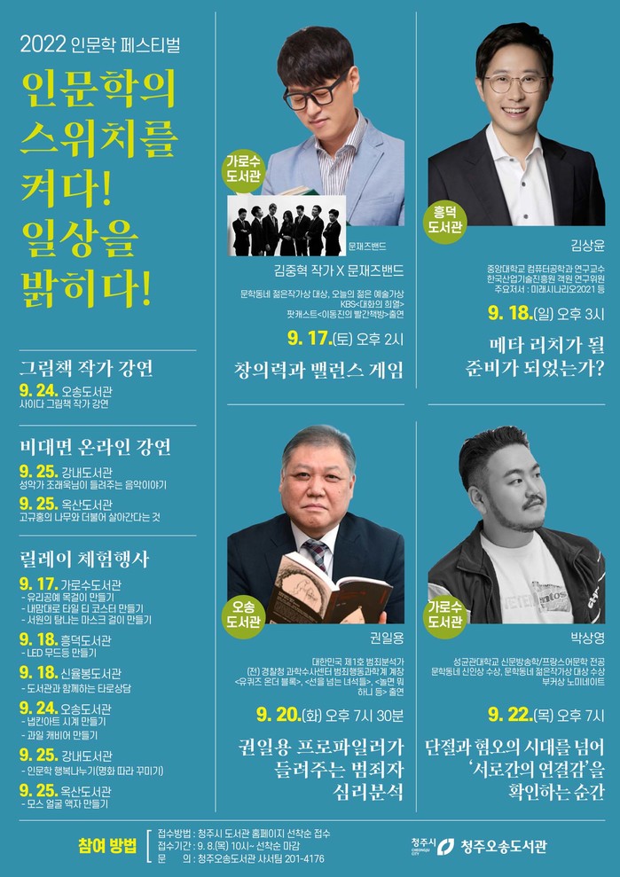이번 인문학 페스티벌은 개막행사 이외에도 9월 18일(토)부터 25일(일)까지 오송도서관 권역별 6개관(오송·흥덕·신율봉·강내·옥산·가로수)에서 박상영 저자와의 만남, 권일용 프로파일러의 범죄심리학 특강 등 인문학 강연과 가족이 함께 체험할 수 있는 체험부스도 운영할 예정이다.
