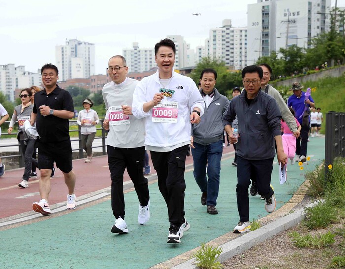 서울 도봉구가 최근 다락원체육공원 일대에서 2024년 제2회 동성제약 도봉마라톤대회를 성황리에 개최했다. 대회는 하프, 10km, 5km 등 총 3개 코스로 나눠 진행됐다. 사진은 오언석 구청장(왼쪽 세번째)이 제2회 동성제약 도봉마라톤대회 참가자들과 함께 달리고 있는 모습.(사진=도봉구청 제공)
