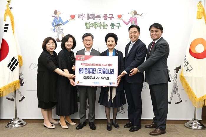 서울 중구가 최근 종이문화재단과 (주)종이나라로부터 아동도서 2만2341권을 후원받고 전달식을 가졌다. 후원받은 도서는 색칠놀이 등에 관련된 것들로 지역내 어린이집 등 66곳에 나누어 비치될 예정이다. 사진은 전달식에서 김길성 구청장(왼쪽 세번째)과 관계자들이 기념촬영을 하고 있는 모습.(사진=중구청 제공)
