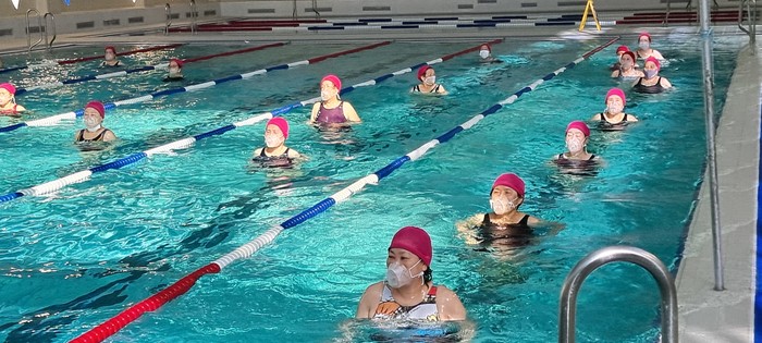 김해시도시개발공사 동부스포츠센터는 코로나19 감염병 확산 방지를 위해 고객 동의를 얻어 모든 이용자들이 물에 젖지 않는 플라스틱 소재 수중마스크를 착용하고 아쿠아로빅 수업을 운영 중이다.이번 수중마스크 착용은 고령층이 많이 이용하고 있는 아쿠아로빅 프로그램으로써 코로나19 예방차원으로 수중마스크 착용과 참여자간 거리두기 등을 통한 철저한 방역 준수 아래 안심하면서 운동을 할 수 있다.