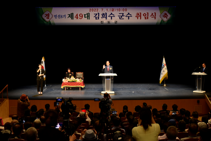 김희수 군수는 이날 오전 진도향교 단군전 봉심 등을 시작으로 공식 일정을 시작했으며, 취임식은 모든 군민이 함께하는 열린 행사로 개최됐다.