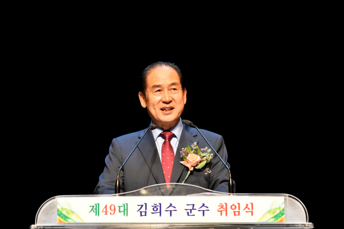 김희수 군수는 취임사를 통해 군민과 하나 된 마음으로 ‘다함께 잘사는 산업’, ‘모두가 행복한 복지’, ‘인재를 키우는 교육’, ‘찾아서 머무는 관광’, ‘군민을 섬기는 행정’이라는 5대 군정 방침을 발표했다.