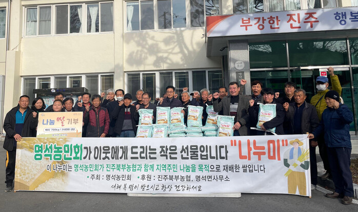 진주시 명석면 농민회(회장 이태희)는 6일 명석면사무소 앞에서 직접 경작해 수확한 ‘나눔 쌀’을 지역사회 소외된 이웃에게 나눠주는 기부행사를 열었다.