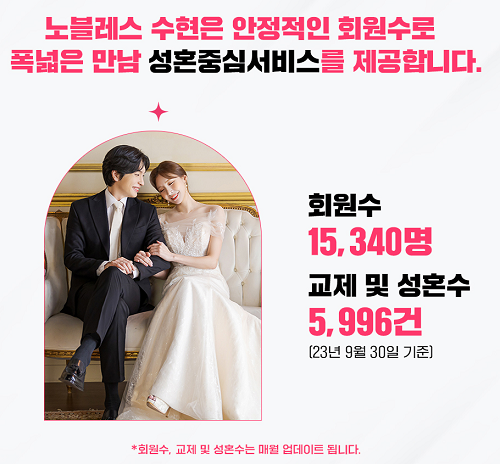 노블레스 수현이 공개한 바에 따르면, 올 9월 30일 기준 전체 회원 수는 전월 대비 477명 증가한 15,340명, 성혼·교제 건 수는 전월 대비 255명 증가한 5,996건으로 집계됐다.