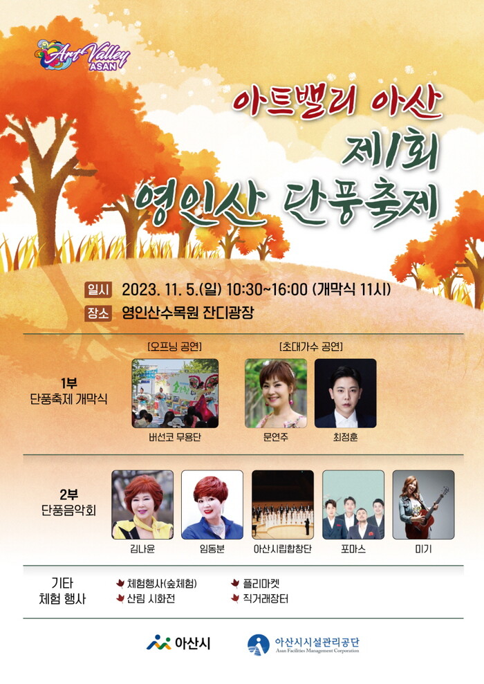 이번 단풍축제는 이날 오전 11시 개막식을 시작으로 시 홍보대사인 트로트 가수 문연주와 최정훈의 개막 축하공연, 버선코무용단, 김나영, 임동분, 아산시립합창단, 포마스, 미기 등 다양한 가수들의 단풍음악회와 산림 시화전, 플리마켓, 직거래장터, 산림 체험행사 등 다채로운 내용을 선보일 예정이다.