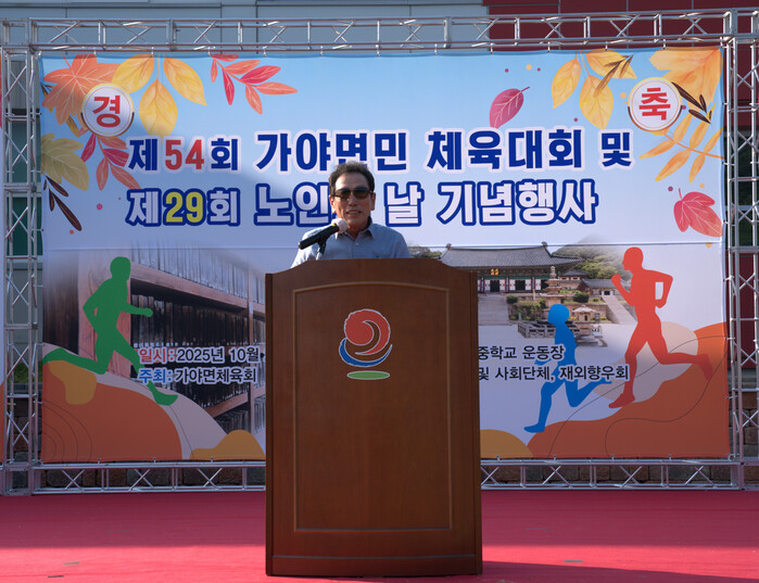 임재후 가야면 체육회장은“본 행사를 위해 바쁘신 중에도 참석하여 자리를 빛내주신귀빈 여러분들께 감사드리며, 이 행사를 준비해주신 여러 관계자분들에게도 감사드린다. 본 행사를 통해 가야면의 건강과 화합을 다지고, 어르신들도 건강하고 의미있는 시간이 되시기를 바란다”며 축사를 전했다.