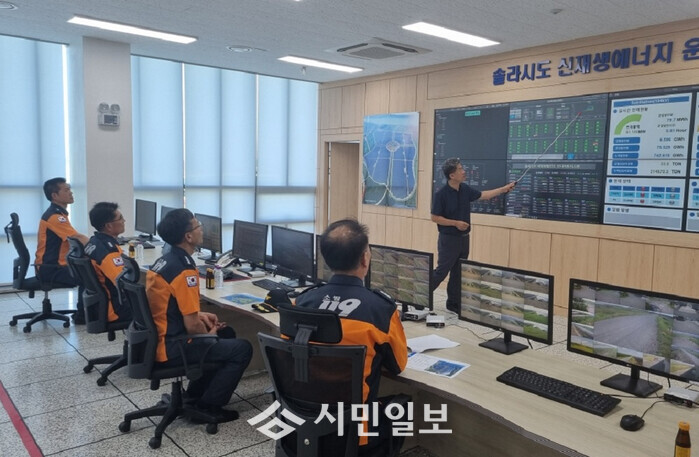 | ▲ 박순천 해남소방서장 등 해남소방서 관계자 등이 15일 ESS(에너지저장장치)화재 위험 예방을 위해 산이면 소재 솔라시도 태양광발전소를 방문해 시설관계자로부터 전력설비 운영 상황 등을 보고 받고 있다. / 해남소방서 제[공 |