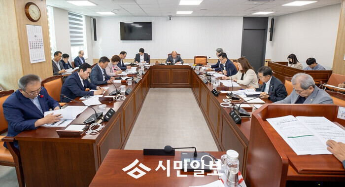| ▲ 이성옥 해남군의장 및 군의원 등이 13일(월) 오전 의회운영위원회실에서 열린 제16차 의원간담회에서 해남군 관계자로부터 2025 전남 캠핑관광 박람회 개최 계획을 청취하며 관련 자료 등을 검토하고 있다. / 해남군의회 제공 |