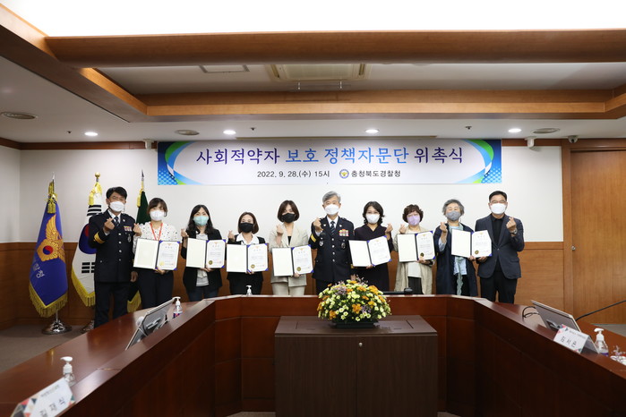 사회적약자보호 정책자문단은 경찰 내부위원 6명과 사회적약자보호에 관한 학식과 경험이 풍부한 피해자 보호 분야별 외부 전문가 8명으로 ▵성폭력 분야, 청주YWCA여성상담소 소장 한영숙 ▵가정폭력 분야, 충주YWCA가정폭력상담소 소장 김서은 ▵성매매 분야, (사)충북여성인권상담소 늘봄 소장 정선희 ▵장애인 분야, 발달장애인지원센터 센터장 김애자 ▵이주여성 분야, 충북이주여성인권센터 대표 정승희 ▵아동학대 분야, 아동보호전문기관 관장 최은희 ▵노인학대 분야, 노인보호 전문기관 관장 김창수 ▵피해자보호 분야, 여성의긴급전화1366센터 센터장 권용선이 각각 자문위원으로 위촉되어 2년간 경찰에서 추진중인 사회적약자 보호정책에 대한 보완·개선사항 논의, 사회적약자보호 관련 정책발굴 및 정책제언 등 자문역할 등을 수행한다.