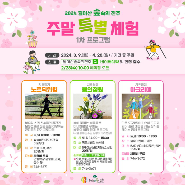 진주시는 3월 9일부터 4월 28일까지 월아산 숲속의 진주에서 ‘2024년 주말특별체험 프로그램’을 운영한다.