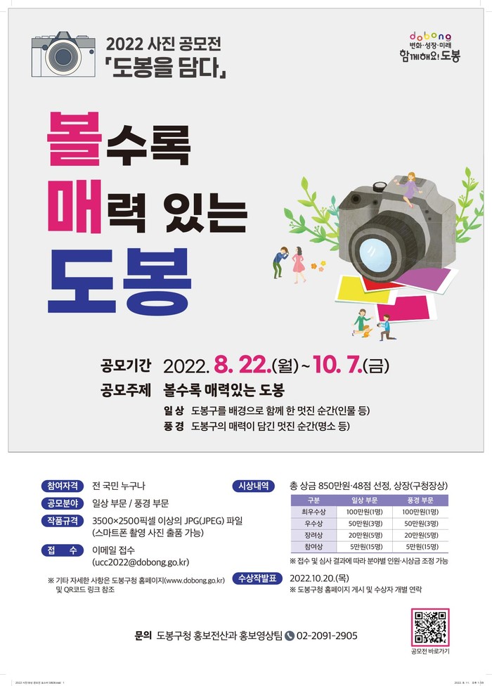 [시민일보 = 박준우 기자] 서울 도봉구(구청장 오언석)는 오는 22일부터 10월7일까지 '2022년 도봉을 담다' 사진공모전 작품을 접수받는다.