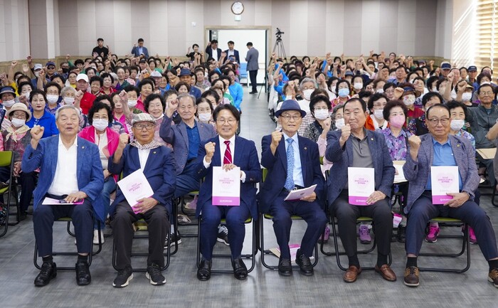 [광주=정찬남 기자] 강기정 광주광역시장(앞줄 왼 쪽부터 세 번째)이 24일 오후 서구 광주노인회관에서 열린 ‘경로당지도자교육’에 광주다움 통합돌봄 등 시정 주요현안에 대한 정책간담회를 진행한 뒤 기념촬영을 하고 있다./광주광역시 제공