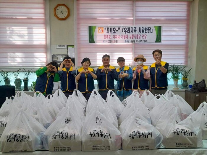 [시민일보 = 변은선 기자] 서울 서대문구 홍은2동은 가정의 달을 맞아 최근 동 지역사회보장협의체가 일명 ‘꼬끼오∼ 우리 가족 사랑한닭’ 사업을 통해 관내 저소득 한부모 및 다자녀 가구 30곳에 누룽지 통닭을 2마리씩 후원했다고 31일 밝혔다.