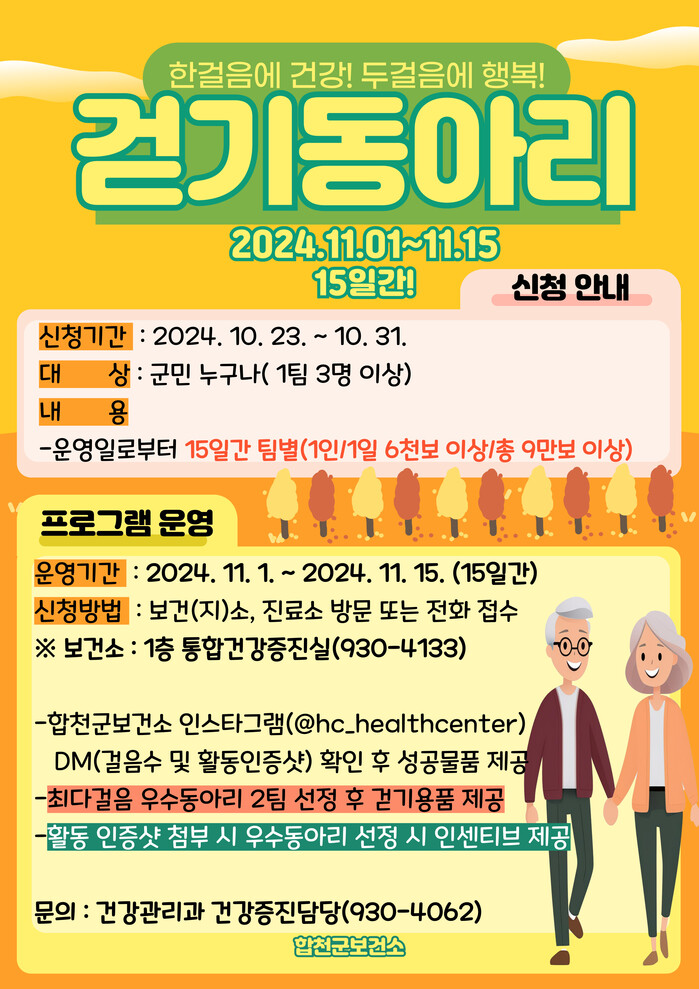 동아리 활동은 11월 1일부터 11월 15일까지 15일간 진행되며, 1인당 하루 6천 보 이상, 총 9만 보 이상을 걷고, 합천군보건소 인스타그램(hc_healthcenter)에 인증샷을 올리면 인증 확인 후 성공물품이 지급되는 방식이다. 또한, 최다 걸음 동아리와 활동 인증샷을 첨부한 우수 동아리 각 2팀을 선정해 별도의 인센티브도 제공할 예정이다.