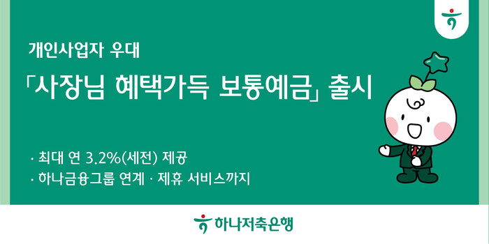 [시민일보 = 여영준 기자] 하나저축은행은 경기 침체로 어려움을 겪는 소상공인과의 상생금융 실천을 위해 '사장님 혜택 가득 보통예금' 상품을 출시했다고 31일 밝혔다.