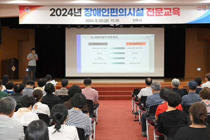 진주시는 장애인 편의시설 관련자의 전문성 향상과 장애인 이동권 보장 등 장애물 없는 생활환경 조성을 위하여 건축사, 공무원, 무장애도시 읍면동 위원 등 200여 명을 대상으로 20일 시청 시민홀에서 ‘2024년 장애인 편의시설 전문교육’을 실시했다.