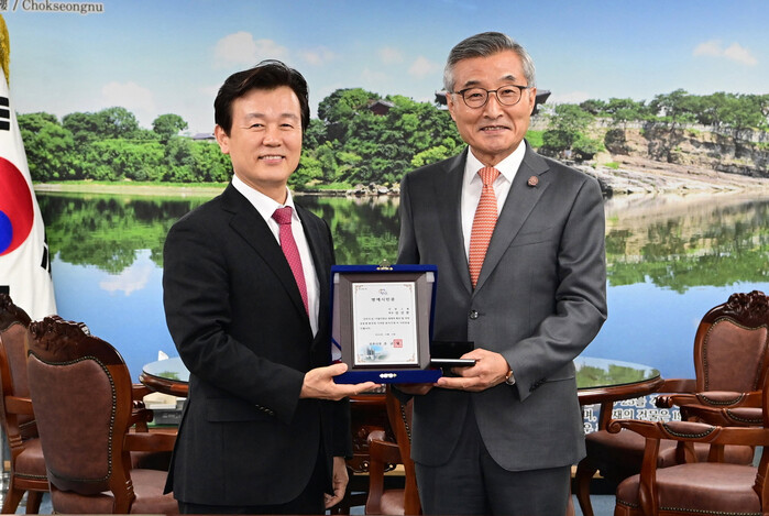 진주시는 지난 11일 시청 기업인의 방에서 김상문 인광그룹 회장에게 진주시 명예시민증을 수여했다.