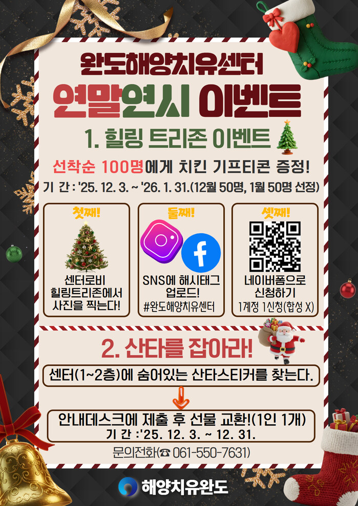 참가 방법은 12월 1일부터 22일까지 네이버 폼을 통해 사전 신청해야 하며, 자세한 내용은 완도해양치유센터 누리집 공지 사항을 통해 확인할 수 있다.