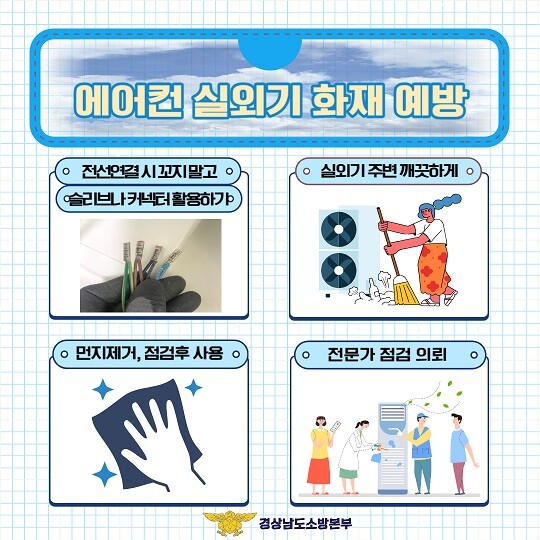 이에 소방서는 에어컨 실외기 화재 예방을 위한 ▲단일 전선 사용 및 전선 훼손 여부 확인 ▲주변 발화 위험 물품 제거 ▲벽과 10㎝ 이상 거리 두고 설치 ▲문어발식 콘센트 사용 금지 등의 안전수칙을 당부했다.
