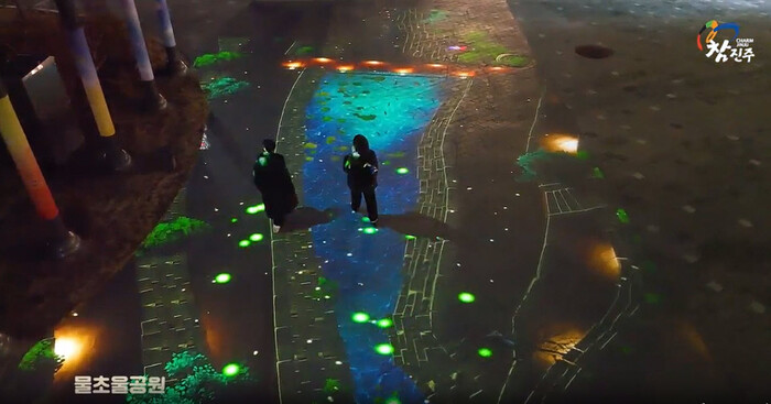 진주시 미디어파사드는 진주만의 역사, 자연, 문화예술을 시각 콘텐츠로 구성해 바닥에 영상을 투사하여 관람객의 움직임에 반응하는 인터랙션 체험 콘텐츠와 관람객이 직접 참여할 수 있는 라이브스케치 콘텐츠가 마련되어 있어 더욱 생동감 있는 체험을 선사한다.