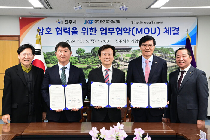 이날 협약식에는 조규일 진주시장, 김종욱 진주 K-기업가정신재단 회장, 오영진 코리아타임스 대표, 조복래 진주 K-기업가정신재단 사무총장, 강승우 코리아타임스 산업부장이 참석했다.