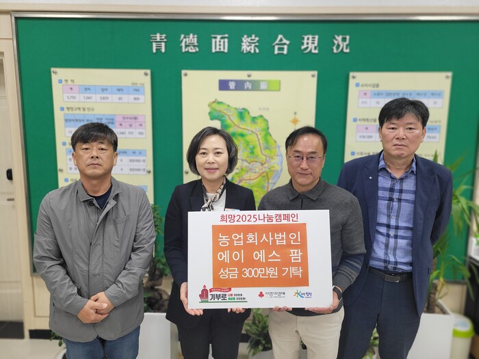 이은숙 청덕면장은 “청덕면의 어려운 이웃을 위해 성금을 기탁해주신 에이에스팜에 깊은 감사를 드리며, 기탁자의 뜻에 따라 성금을 소중히 전달하겠다”고 감사의 뜻을 전했다.