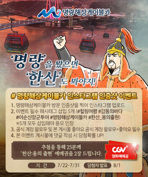 지난 22일부터 오는 31일까지 CGV 이벤트 페이지를 통해서 영화 “한산 : 용의 출현”에 대한 기대 평을 작성하면 추첨을 통해 50분을 대상으로 영화 “한산 : 용의 출현” 관람권과 함께 명량해상케이블카 이용권 2매를 제공한다.