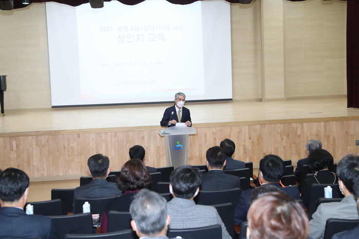 전면적 성인지 교육 강화의 첫 실천으로 경상남도 교육청은 17일(수) 오전, 교육감을 포함한 도교육청 5급 이상 간부(사무관, 장학관 이상) 100여명을 대상으로, 김향숙 한국양성평등교육진흥원 전문강사를 초빙하여, 성인지 감수성 향상 및 성 인식 제고를 위한 성인지 교육을 대면 진행하였다.