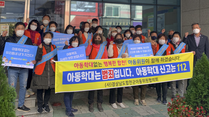 합천군(군수 문준희)은 경남서부아동보호전문기관 주최로 11월 9일 14시 30분 삼성합천병원 앞에서 경남서부아동보호전문기관, 아동위원협의회, 합천경찰서 등 19명과 함께 아동학대 예방주간 기념 캠페인을 개최했다고 10일 밝혔다.
