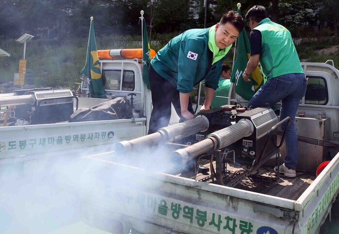 서울 도봉구는 최근 새마을운동 도봉구지회 주관으로 ‘2024년 도봉구 새마을 방역발대식’을 개최해 지역 안전과 쾌적한 환경조성을 위한 결의문 낭독과 방역차량 점검 및 시범방역, 중랑천변 환경정화 활동이 실시됐다. 사진은 발대식 이후 오언석 구청장이 방역차량을 가동하고 있는 모습.(사진=도봉구청 제공)