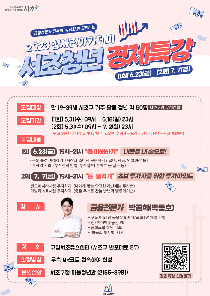 강의는 전액 무료로 진행되며, 19-39세 서초구 거주·활동 청년이라면 누구나 참여할 수 있다. 사전신청은 서초구청 홈페이지의 구글폼 링크로 접속하면 된다.