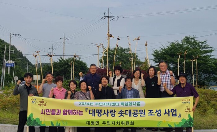 이번 사업은 2024년 진주시 주민자치센터 특성화사업 공모에 선정되어 지난 4월부터 진행됐으며, 대평면 주민자치위원 20여 명은 솟대 나무를 한 달 이상 말리고 다듬는 등 각자의 재능을 기부하여 솟대정원을 조성했다.