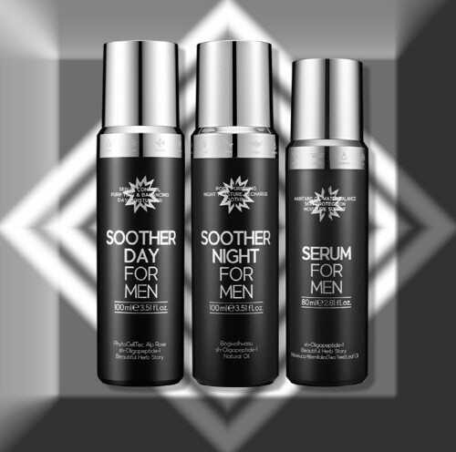 EGF 바머의 스테디셀러 남자 기초화장품 세트 ‘EGF BOMBER 포맨 3-STEP’은 아침 전용 올인원 스킨 ‘EGF 바머 수더 데이 포 맨’과 저녁에 쓰는 ‘EGF 바머 수더 나이트 포 맨’, 그리고 에센스 제품인 ‘EGF 바머 세럼 포 맨’의 구성이다.