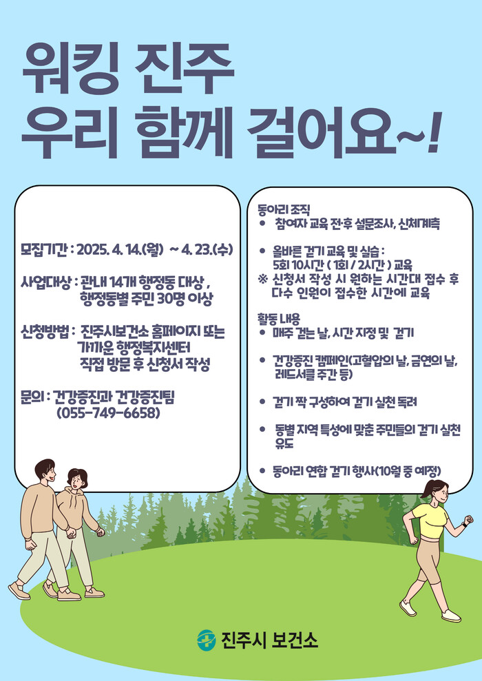 진주시보건소는 걷기의 중요성과 올바른 걷기 교육을 통해 걷기 문화를 확산하고 일상생활 속 걷기를 활성화하여 지역주민의 건강 생활 실천을 높이기 위해 관내 14 개 행정동별 걷기 동아리를 모집한다.