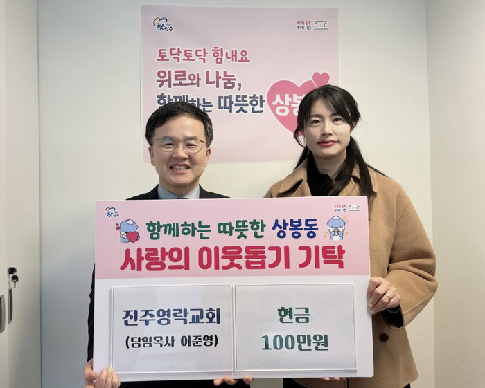 진주시 상봉동행정복지센터는 10일 이현동 소재 진주영락교회(담임목사 이준영)가 다가오는 설 명절을 맞아 어려운 이웃들을 위한 성금 100만 원을 기탁했다고 밝혔다. 기탁금은 진주시복지재단을 통해 관내 저소득층 10가구에 전달될 예정이다.