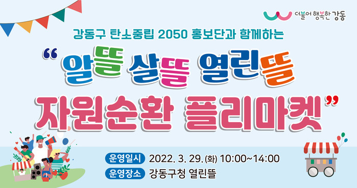 이번 행사는 핸드메이드 신상품과 중고잡화를 판매하는 중고장터, ‘강동구 탄소중립 2050 홍보단’과 연계하여 올바른 분리배출 방법, 투명페트병 및 폐비닐 별도 분리배출 제도 등 다양한 자원순환 정책을 주민들에게 쉽고 재미있게 전달할 예정이다.