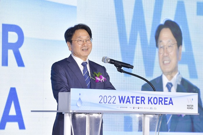 | ▲ 강기정 한국상하수도협회장(광주광역시장)이 31일 오전 경기도 일산 킨텍스에서 열린 국내 최대 규모의 국제 물산업 박람회 '2022 WATER KOREA'에 참석해 축사를 하고 있다./광주광역시 제공 |