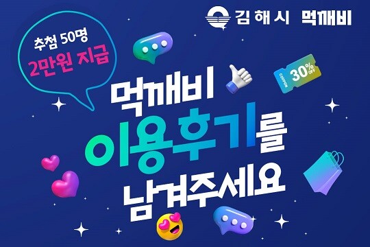 5월 한달 동안 ‘생일 축하해(첫돌) SNS 소문내기’, ‘돌아온 주문왕 BEST10’ 이벤트를 진행하며 추첨을 통해 할인쿠폰 또는 배달앱 상품권을 지급하고 1일부터 21일까지 추첨을 통해 배달앱 상품권을 지급하는 ‘김해시 공공배달앱 이용 후기’ 작성 이벤트도 진행한다. 자세한 내용은 먹깨비 앱과 SNS에서 확인할 수 있다.