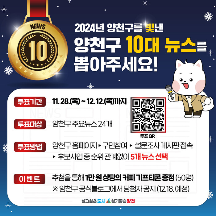 구는 적극적인 참여를 독려하기 위해 참여자 중 50명을 무작위로 추첨해커피 기프티콘을 제공하는 이벤트를 진행한다. 투표 결과는 12월 중 발표되며, 구민들이 직접 선택한 10대 뉴스를 통해 2024년 주요 성과를 공유하고 한 해를 마무리할 계획이다.