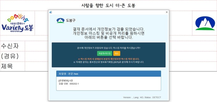 | ▲ 전자문서시스템 개인정보 필터링이 작동 중인 모습. (사진제공=도봉구청) |