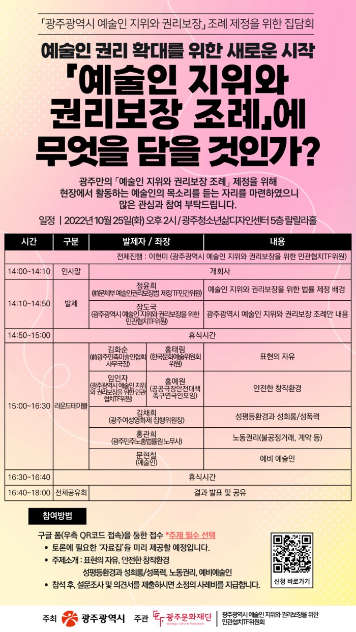광주광역시은 지역예술인들의‘예술인 지위와 권리보장 조례’ 제정을 위해 오는 25일 광주청소년삶디자인센터에서 집담회를 개최한다.