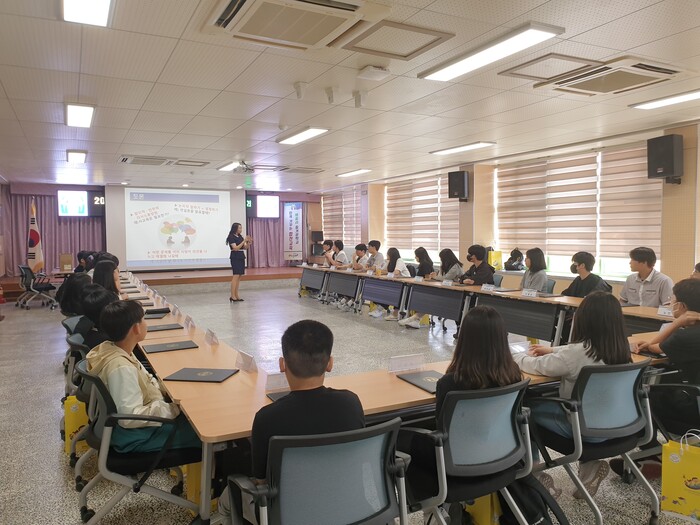 이어「리더십 함양 연수」에서는 경남선거방송토론위원회 장정옥 교수가 ‘미래 리더를 위한 청소년 토론교실’이라는 주제로 이론과 체험 중심의 토론교육을 진행하였다. 연수를 통해 학생의원들은 책임의식을 가지고 주체적으로 회의에 참여하여 공동체 문제를 해결해 나갈 수 있는 리더십 및 자치 역량을 기를 수 있었다. 더불어 학생을 인솔해 온 학생자치 담당교사를 대상으로 ‘학생자치 활성화를 위한 메타버스 활용 연수’를 실시하여 교사의 역량을 강화하는 시간도 마련하였다.